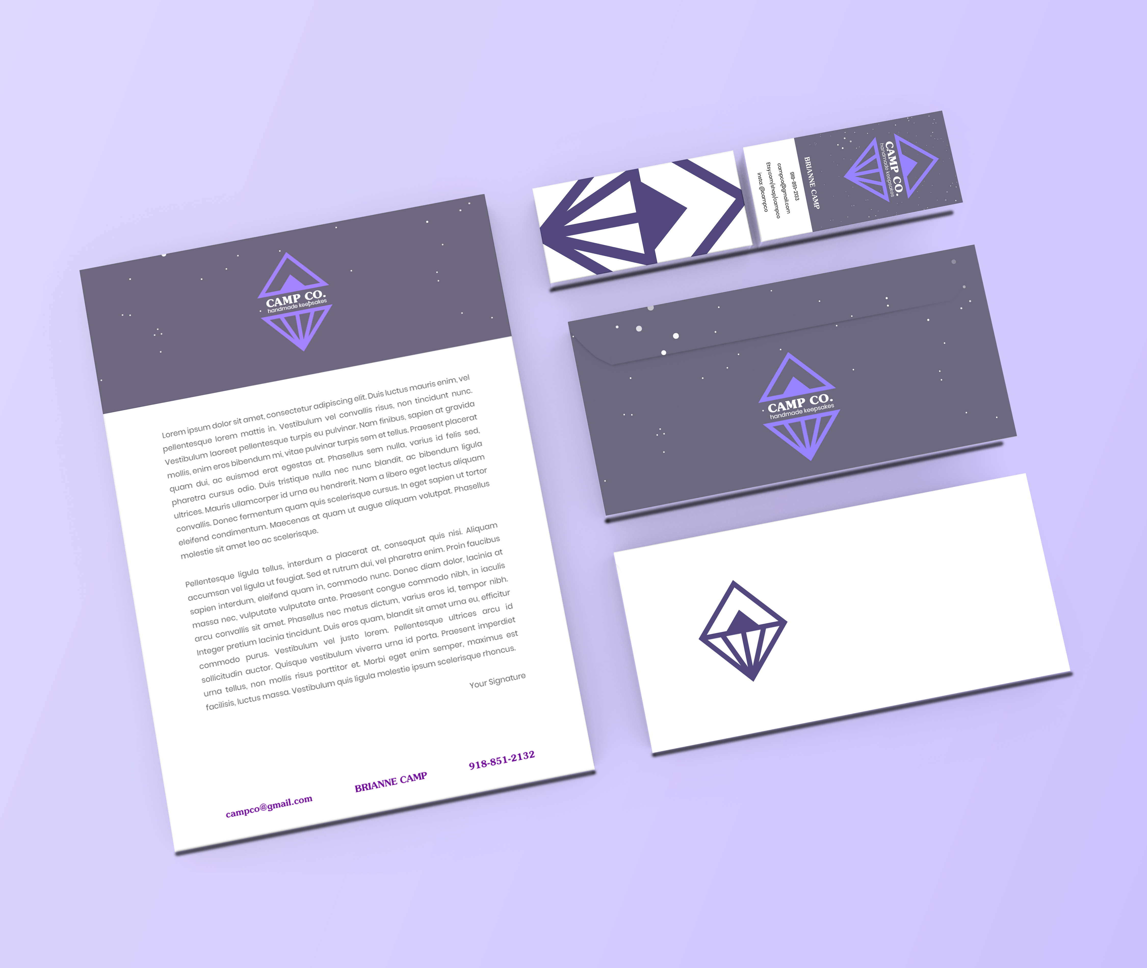This client is a friend of mine who handmakes a variety of keepsakes including jewelry, prints, accessories, and more. She does this as a side hustle and was looking to have a brand to up her marketing game. The logo itself is a play on her last name, Camp, which is the tent shape on the top. It also alludes to the jewelry she makes through the bottom of the design resembling a jewel. This branding is flexible allowing her to play with colors and logo marks as she sees fit.