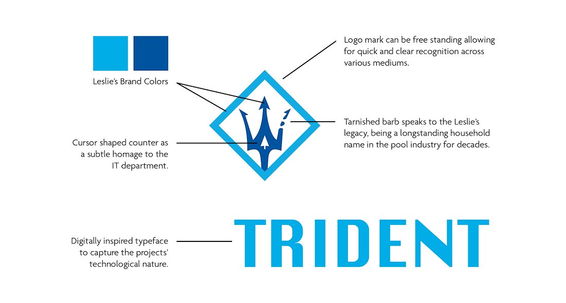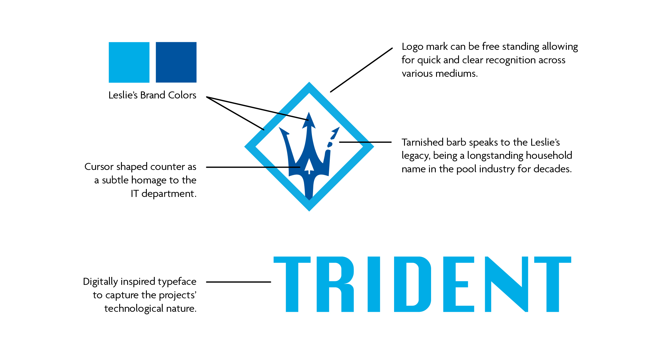 This project was a request I received internally from our IT department to create a logo mark for a campaign they were soon to launch. The name “Trident” was predetermined. Besides the name, I was given free range with creativity and execution. I went ahead and stayed within Leslie’s brand colors, but made all other design decisions with the nature of IT in mind.